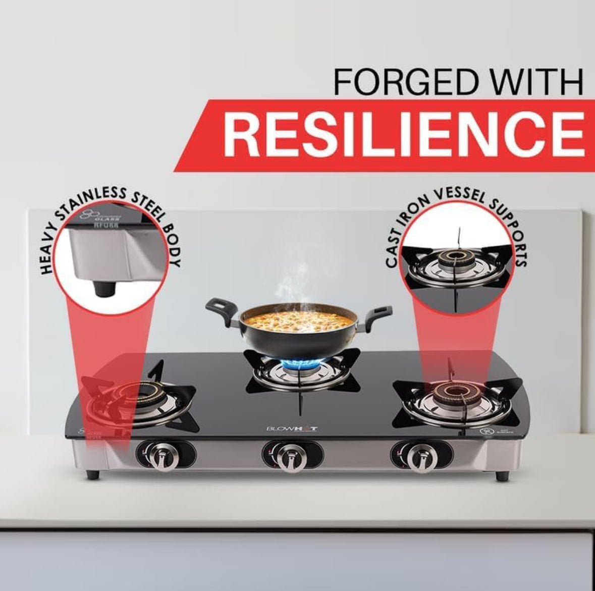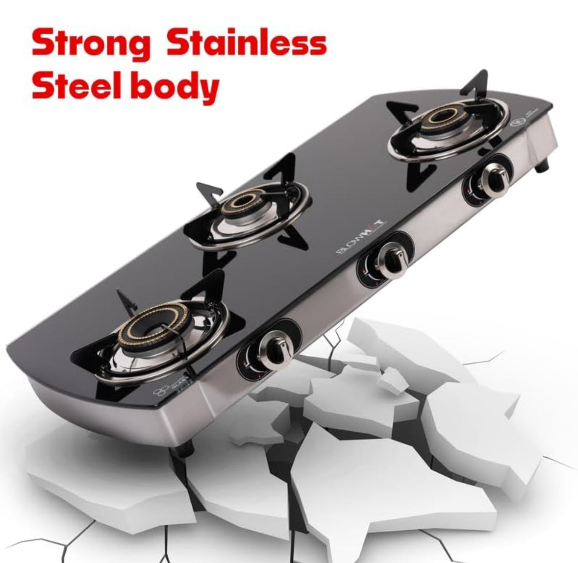 BLOWHOT Jasper 3 Burner Manual Ignition Gas Stove | Heavy Tornado Brass Burners | Toughened Glass Cooktop | ISI certified - Stainless Steel Frame - 2 Years Warranty By Blowhot - (Black)