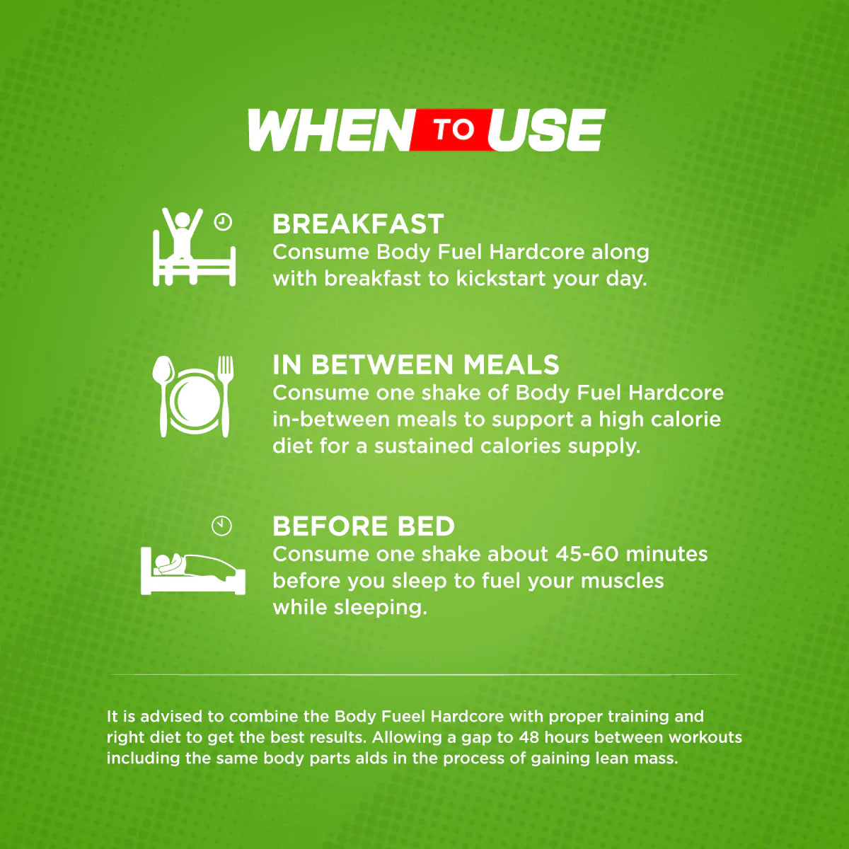 To prepare Body Fuel Hardcore, mix 3 scoop with 300 ml of cold water. Shake it properly in a shaker cup. It is recommended to consume it within 15 mins after the workout for the best results.