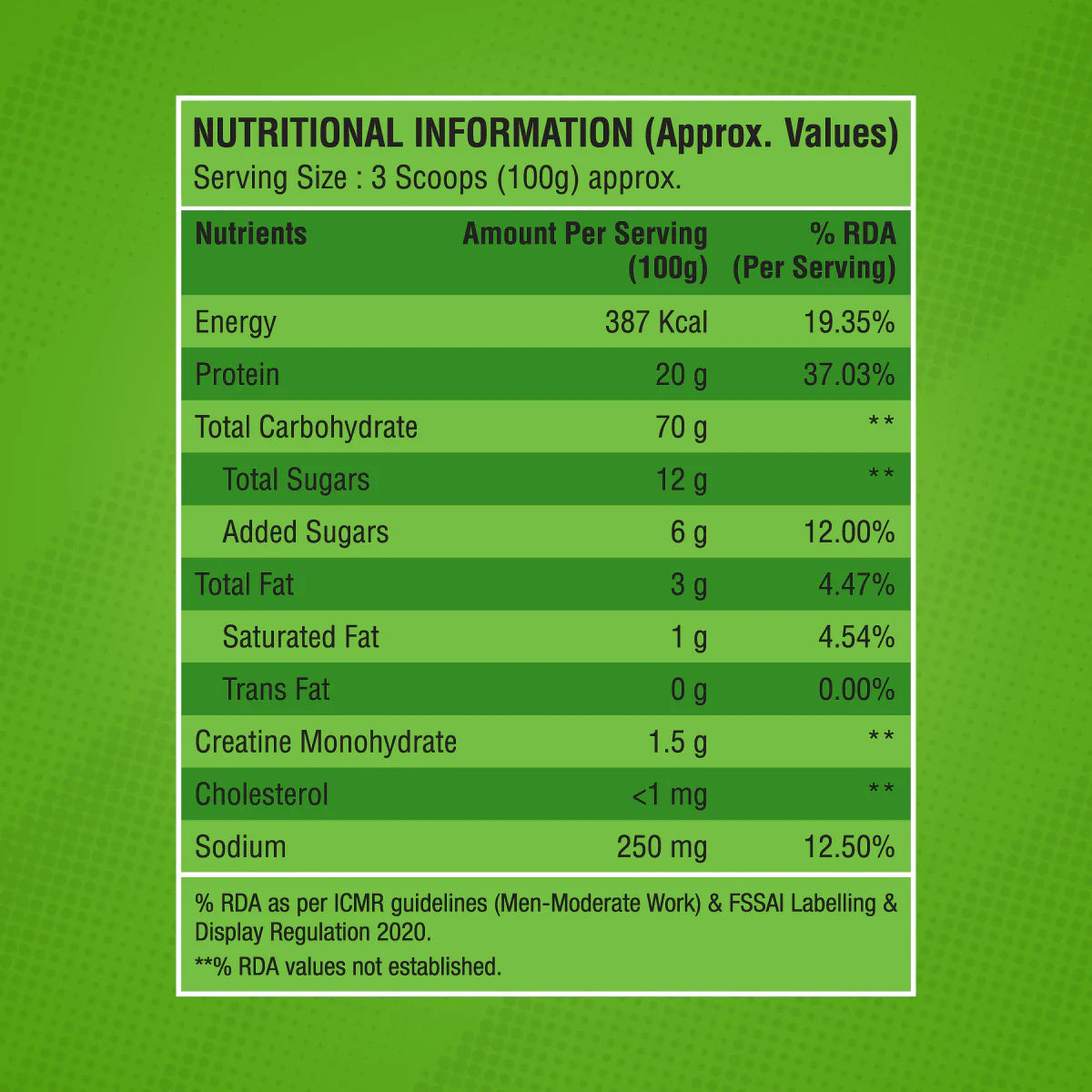 Protein Matrix (50.2%), Milk Solids (Skimmed Milk Powder, Whole Milk Powder, Soy Protein Isolate, Whey Protein Concentrate), Maltodextrin, Starch, Creatine Monohydrate, Nature Identical Flavour, Stabilizer, Emulsifier, Cocoa Powder, Sucrose, Salt, Prohydrolase Enzyme Technology.