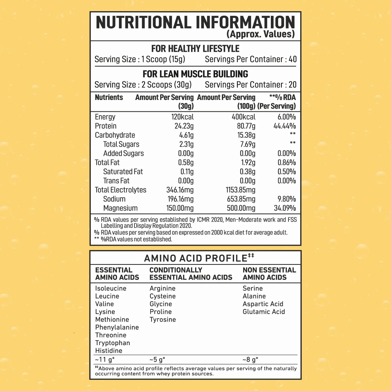 Hydrolysed Whey Protein Isolate (90%), Natural & Nature Identical Flavour (Mango), L-Arginine (For Pump), Sodium Bicarbonate, Magnesium Bicarbonate, Food Colour (Sunset Yellow FCF - INS 110), Acidity Regulator (INS 330). Sodium Chloride, Antifoaming Agent (INS - 990a), Sweetener (Sucralose-INS 955 and Acesulfame-Potassium-INS 950).
