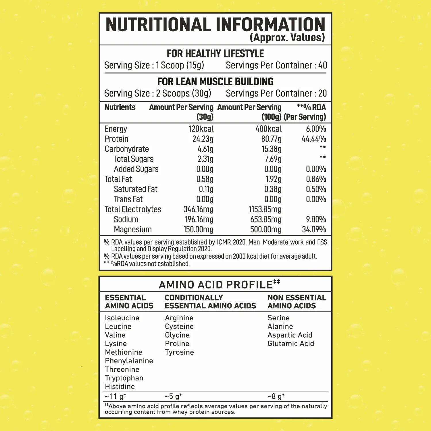 Hydrolysed Whey Protein Isolate (90%), Natural & Nature Identical Flavour (Pineapple), L-Arginine (For Pump), Sodium Bicarbonate, Magnesium Bicarbonate, Food Colour (Sunset Yellow FCF - INS 110), Acidity Regulator (INS 330). Sodium Chloride, Antifoaming Agent (INS - 990a), Sweetener (Sucralose-INS 955 and Acesulfame-Potassium-INS 950).