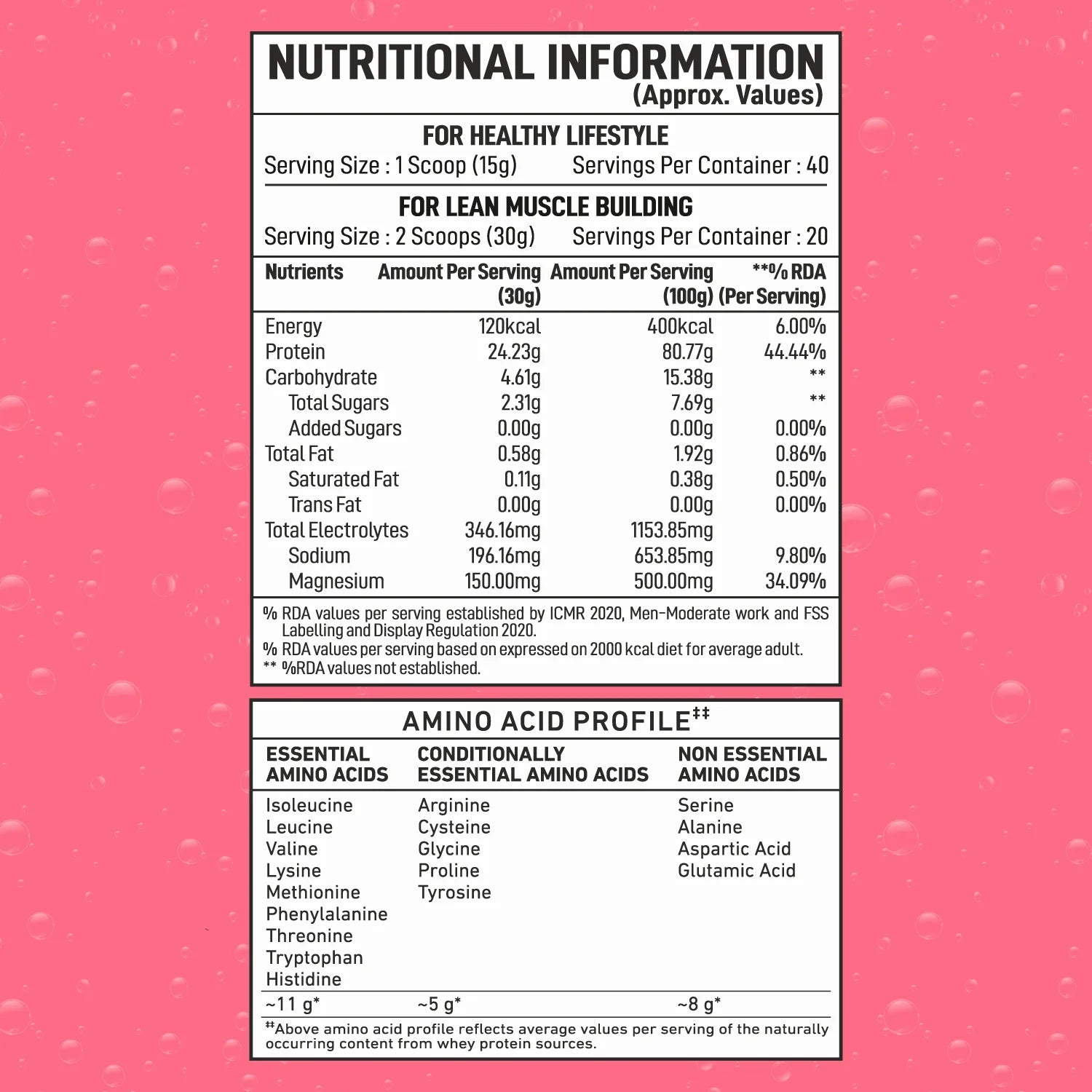 Hydrolysed Whey Protein Isolate (90%), Natural & Nature Identical Flavour (Watermelon), L-Arginine (For Pump), Sodium Bicarbonate, Magnesium Bicarbonate, Food Colour (Ponceau 4R - INS 124), Acidity Regulator (INS 330). Sodium Chloride, Antifoaming Agent (INS - 990a), Sweetener (Sucralose-INS 955 and Acesulfame-Potassium-INS 950).